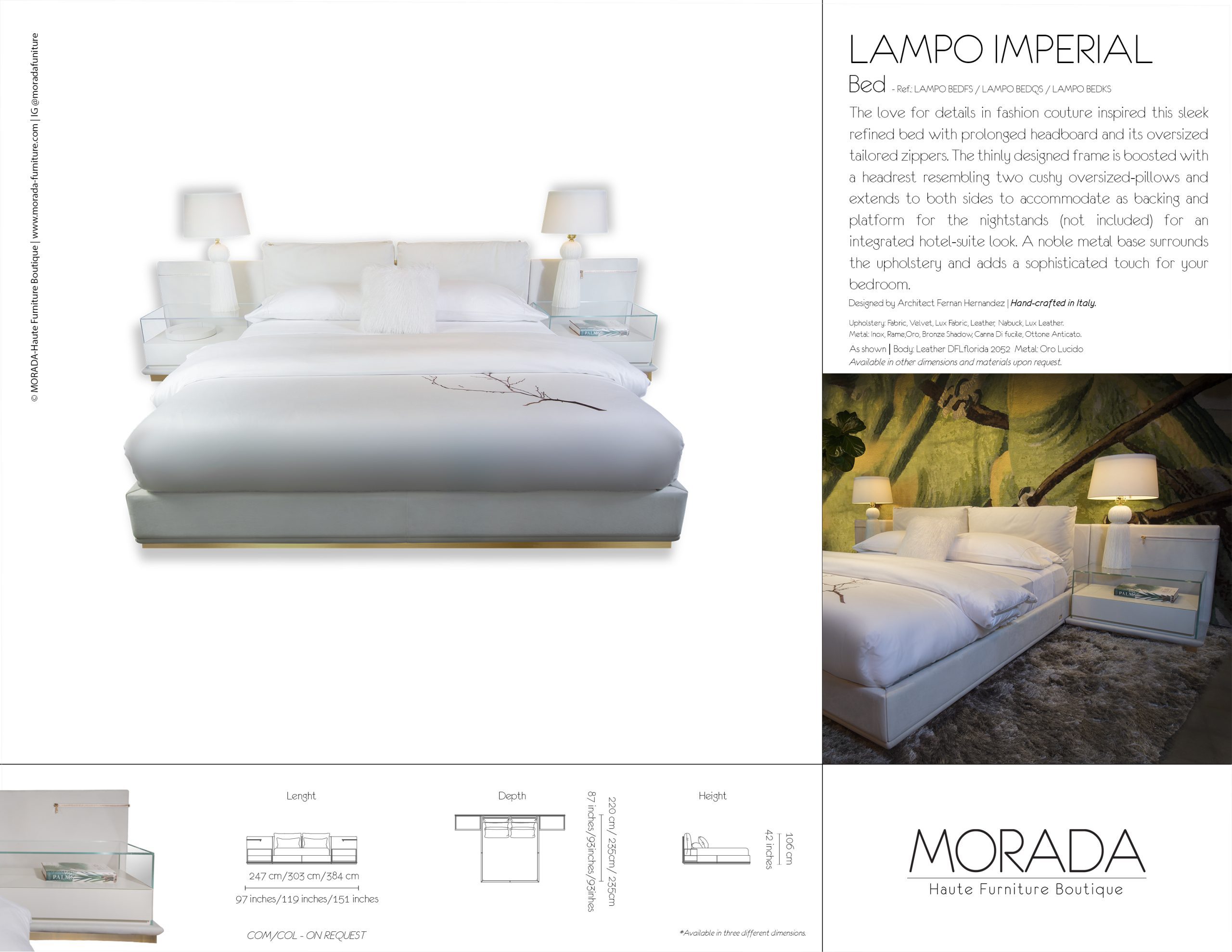 The love for details in fashion couture inspired this sleek refined bed with prolonged headboard and its oversized tailored zippers. The thinly designed frame is boosted with a headrest resembling two cushy oversized-pillows and extends to both sides to accommodate as backing and platform for the nightstands (not included) for an integrated hotel-suite look. A noble metal base surrounds the upholstery and adds a sophisticated touch for your bedroom.