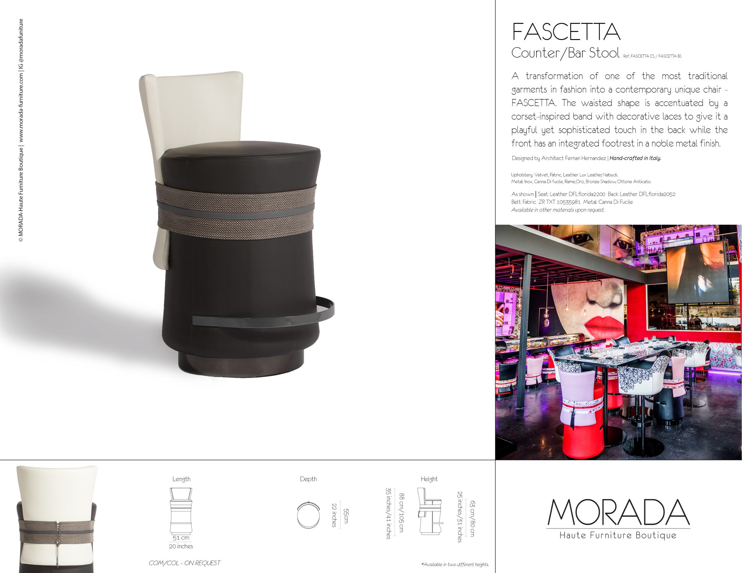 A transformation of one of the most traditional garments in fashion into a contemporary unique chair ? FASCETTA. The waisted shape is accentuated by a corset-inspired band with decorative laces to give it a playful yet sophisticated touch in the back while the front has an integrated footrest in a noble metal finish.