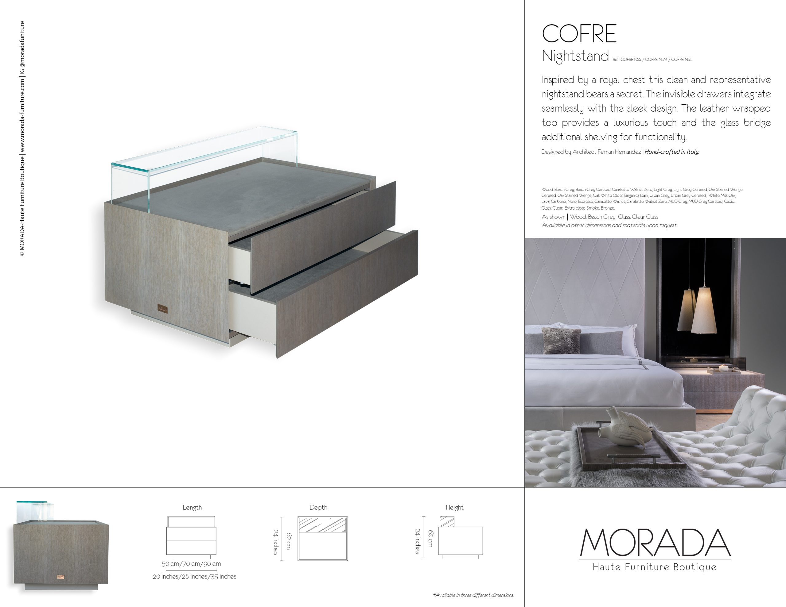 Inspired by a royal chest this clean and representative nightstand bears a secret. The invisible drawers integrate seamlessly with the sleek design. The leather wrapped top provides a luxurious touch and the glass bridge additional shelving for functionality.