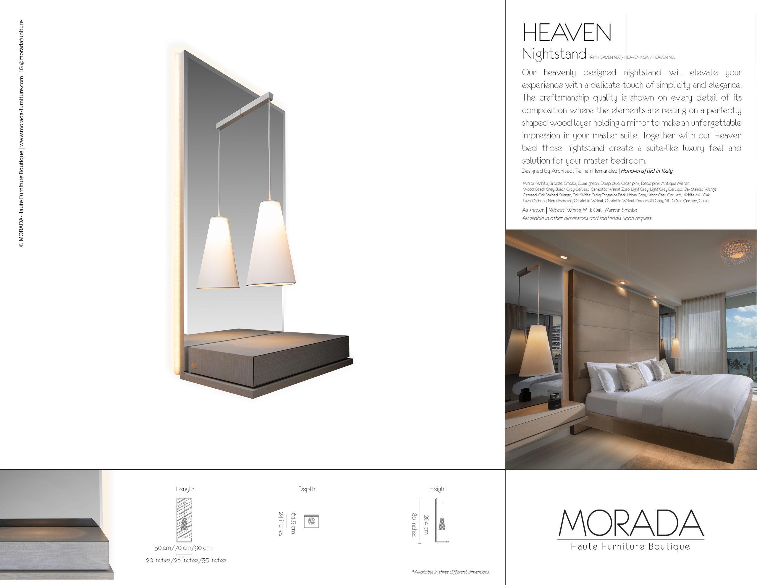 Our heavenly designed nightstand will elevate your experience with a delicate touch of simplicity and elegance. The craftsmanship quality is shown on every detail of its composition where the elements are resting on a perfectly shaped wood layer holding a mirror to make an unforgettable impression in your master suite. Together with our Heaven bed those nightstand create a suite-like luxury feel and solution for your master bedroom.