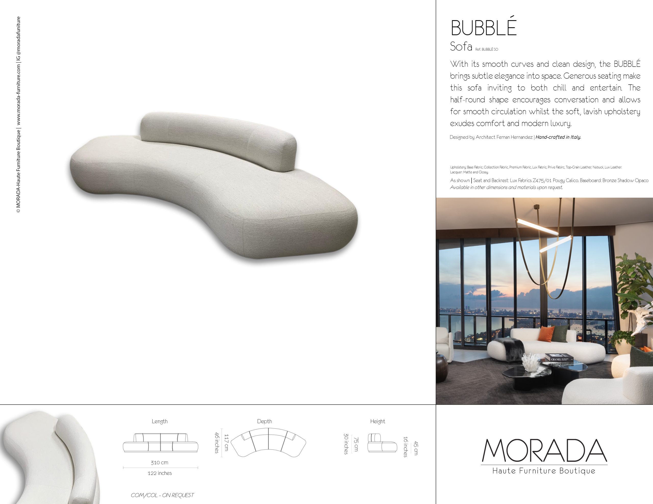 With its smooth curves and clean design, the BUBBLÉ is a contemporary curved sofa that brings subtle elegance into space. Generous seating makes this curved sofa inviting to both chill and entertain. The half-round shape encourages conversation and allows for smooth circulation whilst the soft, lavish upholstery exudes comfort and modern luxury.