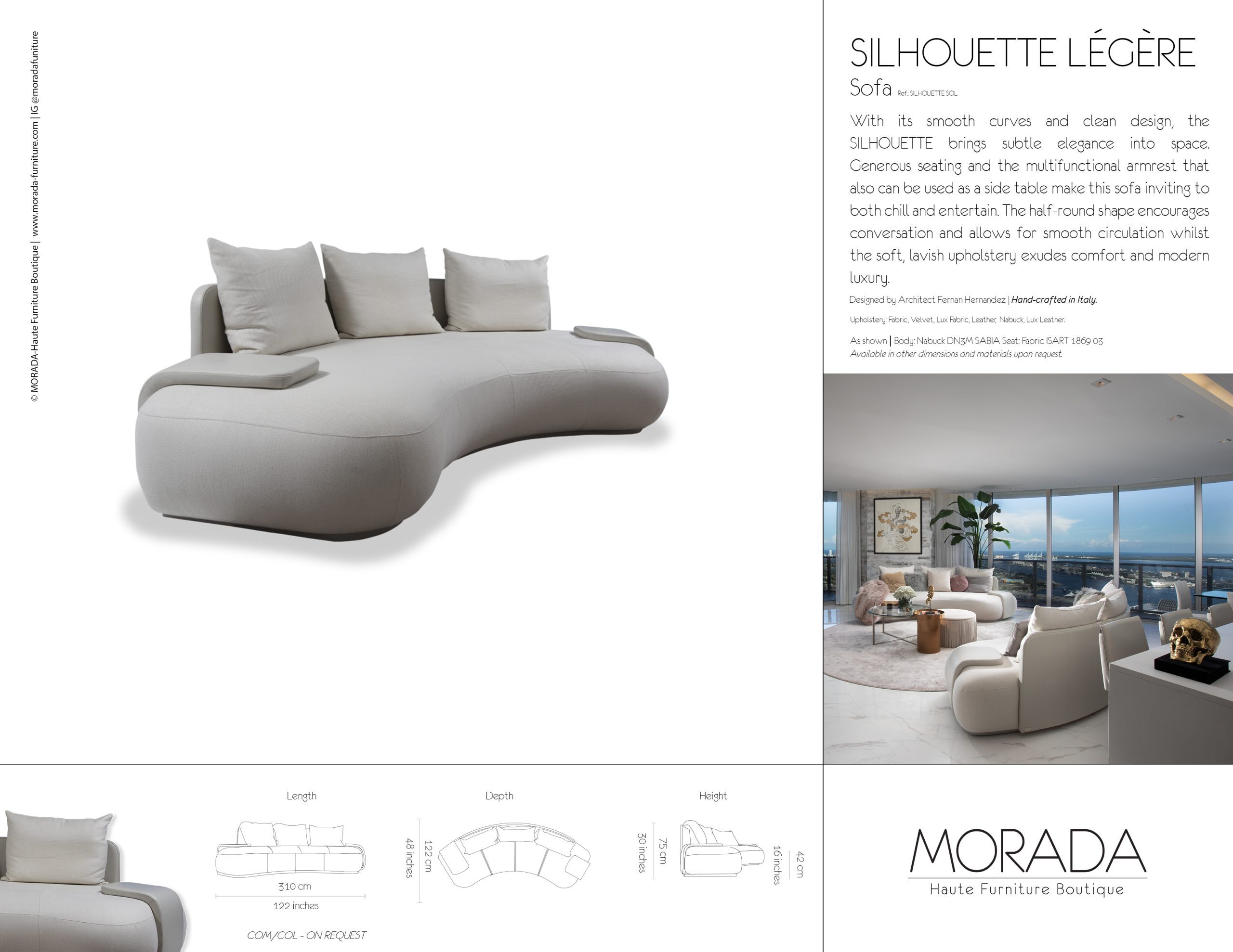 With its smooth curves and clean design, the SILHOUETTE brings subtle elegance into space. Generous seating and the multifunctional armrest that also can be used as a side table make this sofa inviting to both chill and entertain. The half-round shape encourages conversation and allows for smooth circulation whilst the soft, lavish upholstery exudes comfort and modern luxury.